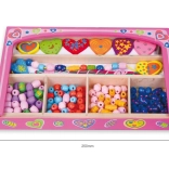Enthalten sind bunte Holzperlen und Schnüre, sodass Kinder sofort nach dem Öffnen mit dem Basteln von Armbändern und Halsketten beginnen können.