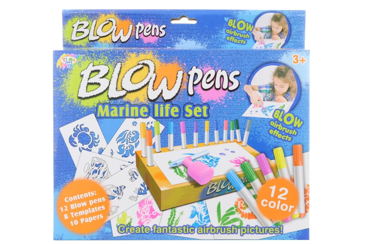 - Pappständer und Halter für Stifte, 12 Farbstifte, 8 Schablonen, 6 Papiere, Blasaufsatz mit Pumpe