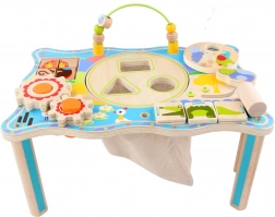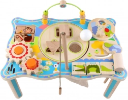 Der Holztisch mit Dschungelmotiven verbindet Spaß mit Lernen und fördert Feinmotorik, Hand-Auge-Koordination und logisches Denken. Kinder können Zahnräder drehen, Perlen auf der Bahn schieben, mit der Klopfbank Kraft und Konzentration trainieren und durch das Steckspiel die Formenwahrnehmung üben. In der Mitte befindet sich ein Leinenbeutel für geangelte Fische und Spielteile, der die Spielfläche ordentlich hält.