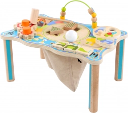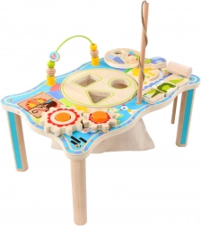 In der Mitte des Tisches befindet sich eine Öffnung mit Leinenbeutel zum Angeln der Fische mit der Magnetangel. Kinder trainieren Geduld und Genauigkeit und haben die Teile zugleich stets griffbereit.