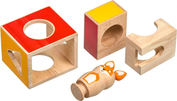 Dieses hölzerne Lernspiel enthält drei massive Blöcke mit Aussparungen in verschiedenen Formen, eine Holzfigur der Füchsin sowie einen Satz beidseitiger Aufgabenkarten in unterschiedlichen Schwierigkeitsgraden. Kinder bauen und kombinieren die Blöcke nach den Vorlagen, damit sich die Füchsin richtig „versteckt“, und trainieren so Strategie und räumliches Wahrnehmen.