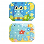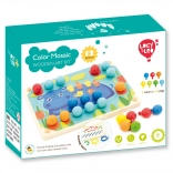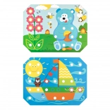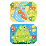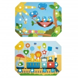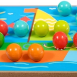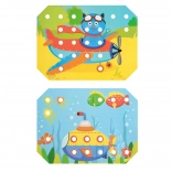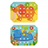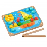 Kinder wählen eine der farbigen Vorlagen, legen sie auf den Holzsockel und füllen das Bild mit Stiften mithilfe der Pinzette oder mit den Händen aus. Sie können auch das Schnüren und Sticken mit den beiliegenden Schnürsenkeln üben. Das Spiel unterstützt auf natürliche Weise Konzentration, Logik, Geduld und Genauigkeit.