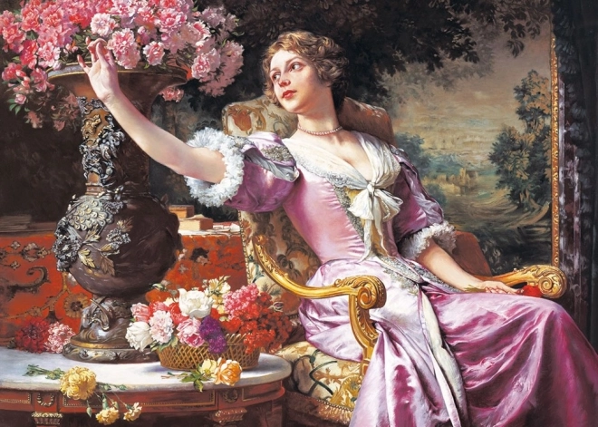 3.000 Teile stellen ein elegantes Bild einer Frau in wunderschönen lila Kleidern, umgeben von Blumen, dar.