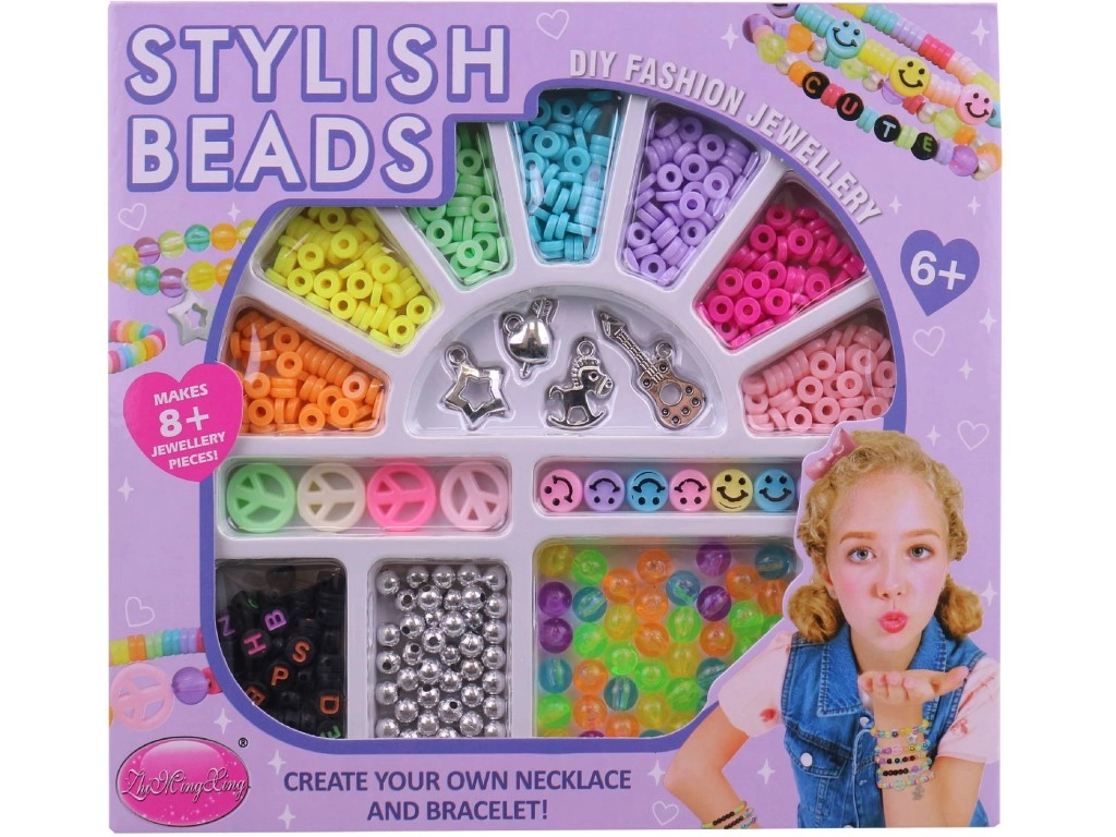 When colors, shapes, and imagination come together, unique children’s jewelry is created. Beads and jewelry for kids offer creative fun for beading and jewelry making: colorful beads in various shapes and sizes, letter beads, charms, cords, and clasps for original bracelets, necklaces, and rings. Choose from wooden beads, plastic and silicone pearls, themed bead sets, stringing kits, and creative boxes.