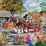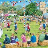 The set contains 4 puzzles with the same piece count and size (May Day Celebrations, Campfire, Harvest Festival, Christmas). Templates of the assembled scenes are included. Assembled puzzle size approx. 49 x 34 cm