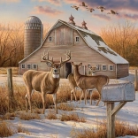 A scene with deer, a barn, and geese in flight will delight lovers of nature and tranquil rural vistas.