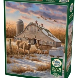 Discover the charm of a winter landscape with deer, a barn, and flying geese—the detailed illustration creates a striking motif that nature and countryside enthusiasts will love. COBBLE HILL puzzles are known for their precise quality and unique die-cut, delivering a one-of-a-kind puzzling experience.