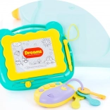 lights, melodies, and sounds; drawing board with pen; mirror; gears; removable keys with controller