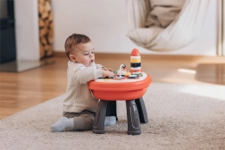 The table supports learning through play: children learn to distinguish shapes, colors, and sounds, and practice their grip and hand-eye coordination. In the center is a fun feature: pull the knob and the kitty spins inside the dome. It includes gears, rattling beads, and elements for stacking towers. The entire table can be easily used as a practical storage box.
