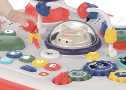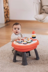 A fun interactive table for little ones that develops sensory perception, fine motor skills, and creativity. It offers light and sound effects, a two-level volume control, a rotating panel with a side for Lego-type bricks, and plenty of buttons, gears, and play features. The panel can be removed, and the table also serves as a storage box for toys.