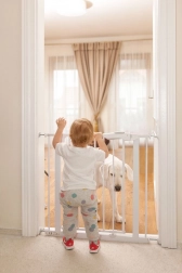 This children's safety gate is the ideal solution for protecting your child at home. It is suitable for installation in doorways, corridors, and at staircases. Installation does not require drilling, which means you won't damage walls or frames. Thanks to the lowered threshold height and secure double lock, passage is easy for adults but safe for small children.