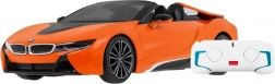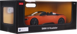 A realistic replica of the BMW i8 Roadster by RASTAR in 1:12 scale with finely crafted details, 2.4 GHz control, and LED lights. Enjoy smooth driving in all directions, rubber wheels for better grip, and independent suspension for stability on various surfaces.