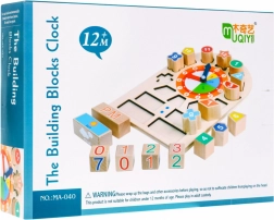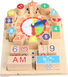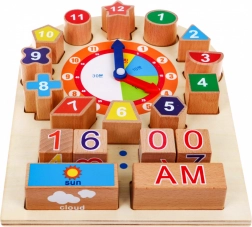 This wooden clock set helps your child easily learn how to recognize time, part of the day, weather, and months. It includes two movable hands that can be freely set for different hours. The child can instantly note the time using numbered cubes and also identify the time of day, whether it is sunny, cloudy, rainy, or snowy. The numerical cubes have different shapes that must be correctly placed on the board.