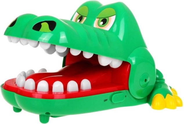 | The crocodile boldly opens its jaws and we see a row of beautiful, straight teeth, but unfortunately one of them hurts. Press your finger down on any tooth in turn (with multiple players, take turns). 3 GAME VARIANTS: 1. SORE TOOTH - red button - activates the first game mode. - after pressing it, start the game: press one tooth after another... If you hit the sore tooth, the crocodile will bite you! That means you lose. 2. REFLEX GAME: - press the tooth that lights up orange, - quickly press the teeth that light up one after another; the lighting speed will increase, - if two teeth light up at the same time, try to press them as fast as possible one after the other, - if you press incorrectly three times, the crocodile closes its jaws, you lose, the game ends. - at the end of the game, the number of lit teeth will correspond to your reflex level. 3) MEMORY: - press the green-lit tooth, - memorize the lit teeth, - when the crocodile asks "Which tooth hurts?", press the teeth you memorized, - you can try again if your answer is correct, - the number of lit teeth will increase and their lighting time will keep getting shorter. - if you answer incorrectly, the crocodile’s jaws will close and bite your finger. | ||