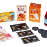 The set includes many accessories, such as imitation food products and cards (VIP and credit cards), which enrich children's imagination and allow them to play the role of a seller in a shop.