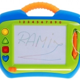 This magnetic drawing board supports creativity, fine motor skills, and concentration. The drawing area has four colored sections (yellow, blue, red, green), making pictures look vibrant while naturally practicing color and shape recognition. The stylus is attached with a cord so it doesn’t get lost, and the slider beneath the drawing area clears everything in one swipe.