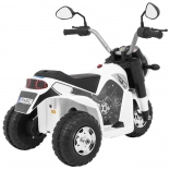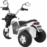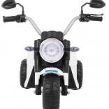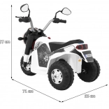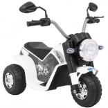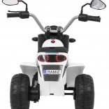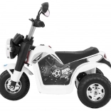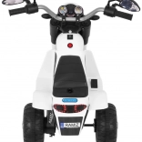 The Children's Electric Motorcycle MiniBike in elegant white offers kids safe fun and their first riding experience. Thanks to its three wheels it is stable, and it features front LED lights, engine start sound, and melodies on the steering wheel. It is powered by a RS380 6 V motor with a 6 V / 4.5 Ah battery, and comfort is ensured by a black eco-leather seat.