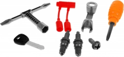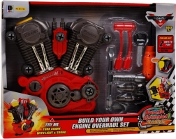 The set includes various plastic tools that allow children to realistically try out engine repairs and modifications.
