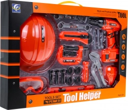 - drill driver, elasticated helmet, elasticated safety goggles, spirit level, screw vise, snap-off utility knife, box-end wrench, adjustable wrench, adjustable pliers, welder’s mask with elastic band, socket screwdriver, 4× screw, 4× nut, drill bit, flat and Phillips bit.