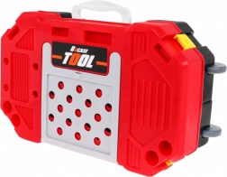 The set comes well equipped: cordless drill/driver, hammer, vise, saw, pliers, Allen and open‑end wrenches, screwdrivers, screws, nuts, gears, tape measure, and threaded work elements for endless screwing and assembling. Thanks to the smart tool organization, kids practice tidiness, patience, and hand‑eye coordination.