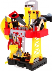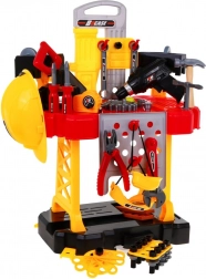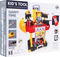 A complete kids' set for little makers offering 3‑in‑1: a workbench, a tool box, and a site manager costume. The box includes 85 pieces of realistic plastic tools and accessories, including a cordless drill/driver (2× AA, not included), helmet, safety goggles, and masks. Perfect for developing fine motor skills, creative play, and safe introduction to tools for children aged 3+.