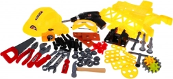 - cordless drill/driver, hammer, vise, saw, pliers, 2 screwdrivers, 4 wrenches, 16 screws, 16 nuts/adaptors, 4 pegs, 6 hooks, tape measure, 3 gears (1 large, 2 small), safety goggles, protective mask, helmet, 3 wooden pieces with threads, 8 flat pieces with holes