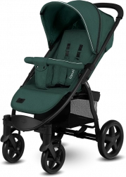 The lightweight frame folds to a small size, and the automatic lock prevents unfolding. Included are a basket, cup holder, mosquito net, and footmuff.