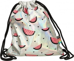 A light and stylish drawstring backpack with a holographic effect and a playful watermelon print. It features a drawstring main compartment, a practical front zip pocket, and sturdy drawstring shoulder straps for comfortable carrying. Ideal for school, PE, leisure time, and city errands.