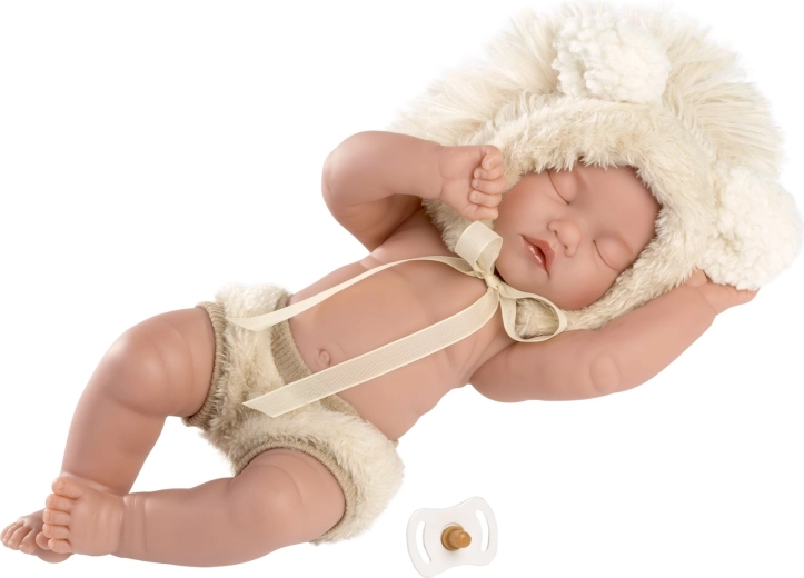 This sleeping realistic doll is ideal for children who want to experience caring for a baby. Thanks to the full vinyl body, the doll can be bathed, and its design captures every detail of the baby body, including cute little rolls. The doll has jointed arms and legs, making it poseable and able to sit. A pacifier is included as a stylish accessory. This doll was hand-made in Spain and is packed in a beautiful gift box.