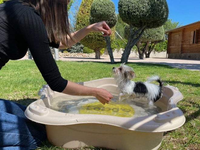A practical and durable pool for dogs and cats from LOBOO makes bathing and summer cooling more enjoyable. Thanks to the comfortable handle, rounded anti-chew shapes, and drainage grooves, it is safe and easy to use. Made from eco-friendly plastic with almond shell blend for higher strength and durability.