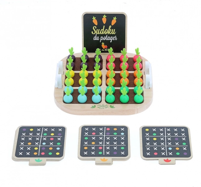 Here's a unique opportunity to entertain children while developing their cognitive abilities. The Vegetable Sudoku game is made of high-quality wood, ensuring its stability and durability. With colorful wooden vegetable-shaped pieces, children strive to fill the grid according to the included cards without repeating colors in the same row, column, or block.