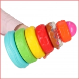 This stable and safe sensory tower brings children the first joy of learning through play. Rings in different sizes, colors, and textures support fine motor skills, hand–eye coordination, and color recognition. One ring has a transparent top with beads that rattle, also stimulating hearing.