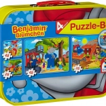 Children will be delighted with the practical tin suitcase that contains four puzzles of varying difficulty featuring the popular elephant Benjamin Kvítko. A great way to develop children's skills.