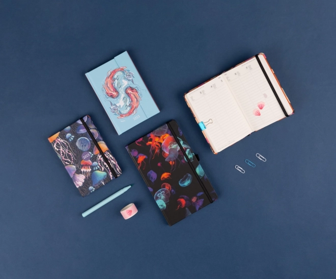 13 × 21 cm format, an elastic band for secure closure, and a practical pen loop for work anywhere.