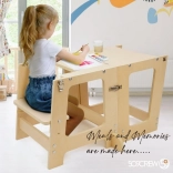 The Prema 3in1 learning tower is made from high-quality and durable plywood, offering easy assembly and long-lasting use. It features 2 height levels (16.5 cm and 22.5 cm) to easily adapt to your child's growth.