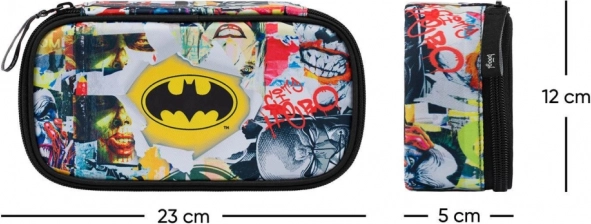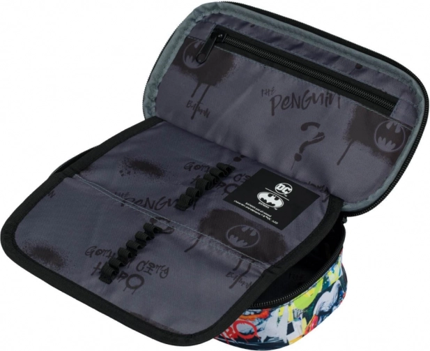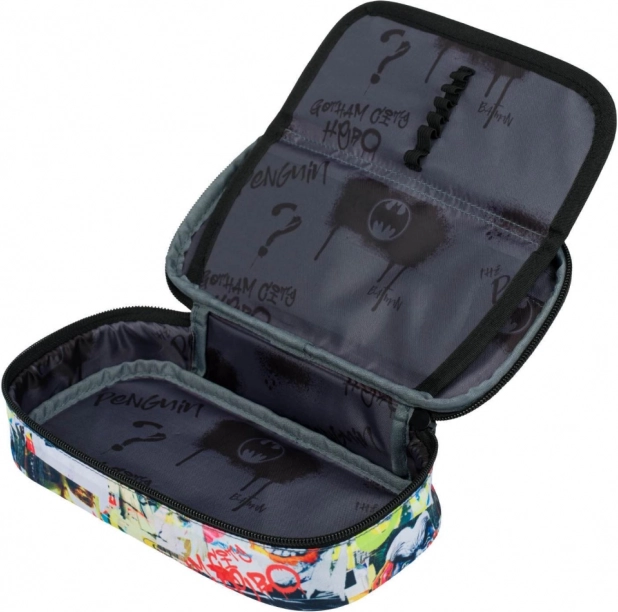 This school pencil case with Batman Comics design features original comic patterns that will appeal to all superhero fans. It is equipped with a flip-open internal partition ensuring easy organization. It also has an internal zip pocket and a special slot for a timetable, enhancing its practical usability. The pencil case is made of textile material, which adds lightness and durability.