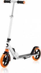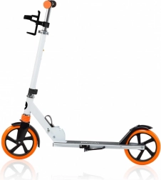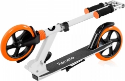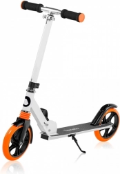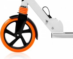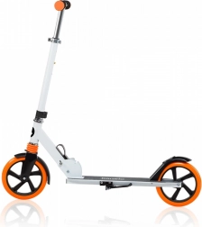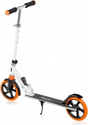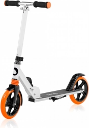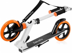 The city scooter Lionelo Luca White Orange combines a lightweight aluminum construction, large 200 mm PU wheels, 3-step adjustable handlebar, and a load capacity up to 100 kg. It offers a smooth ride thanks to ABEC-7 bearings, a safe rear fender brake, a non-slip deck, and practical folding with a carrying strap and a kickstand.