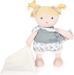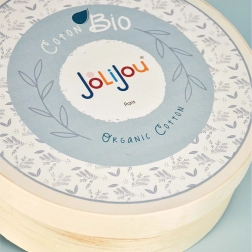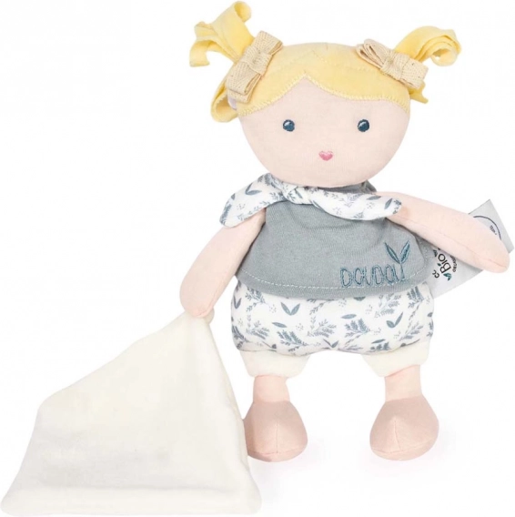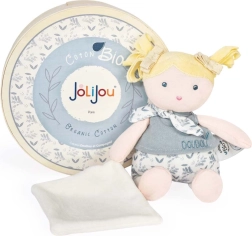 The adorable Bleuette doll made of organic cotton is gentle, safe, and ideal for newborns. Includes a reversible blanket and a round gift box made of natural wood. The doll has embroidered eyes and heart-shaped mouth, a soft textile body, and filling made from recycled fibers. It is machine washable at 30 °C and meets European CE safety standards.
