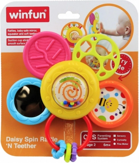 The Daisy Baby Rattle is equipped with various elements including a rattle, teether, safe mirror, and squeaker. Easily attach this rattle to smooth surfaces, allowing your baby to spin the daisy, thereby promoting tactile skills. The soft teethers soothe teething gums, while the colorful moving parts encourage sensory perception and support the development of fine motor skills.