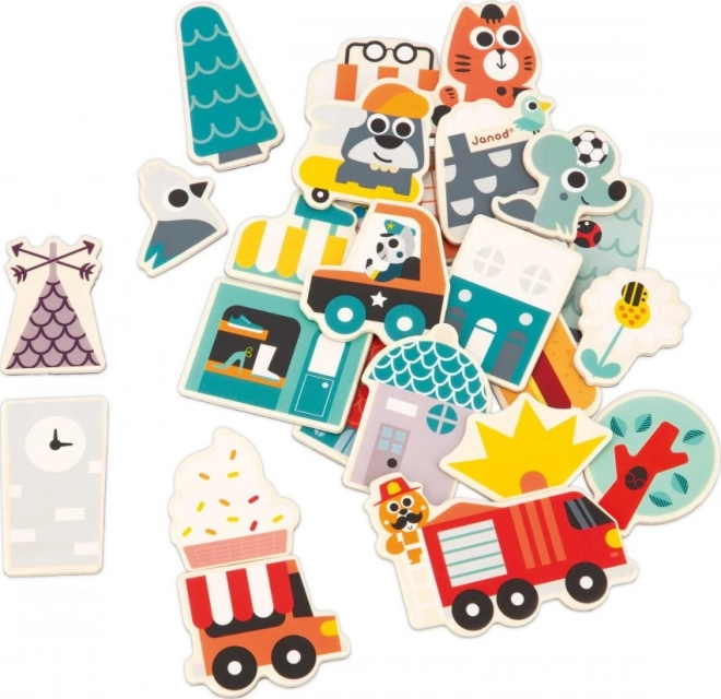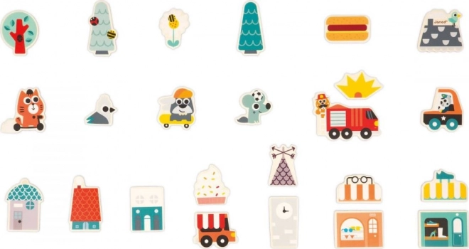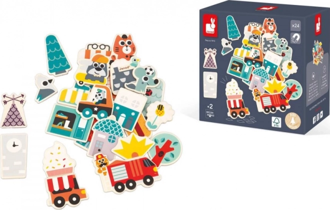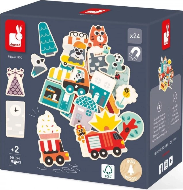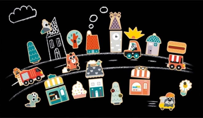 With this playful magnet set, children can easily create their own bustling city. It includes a fire truck and police car, a food truck, a scooter, and a skateboard, as well as building and shop magnets. Thanks to the wooden design, the magnets feel pleasant in the hand and are durable for everyday play.