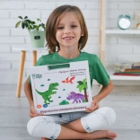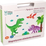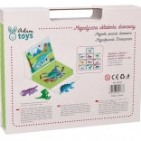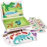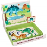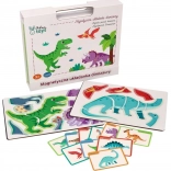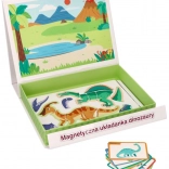 Box contents: a magnetic board 26 × 19 cm, 10 colorful cards with illustrations and names of dinosaurs, and 51 magnetic pieces for assembling. The product is made from safe materials and meets CE standards.