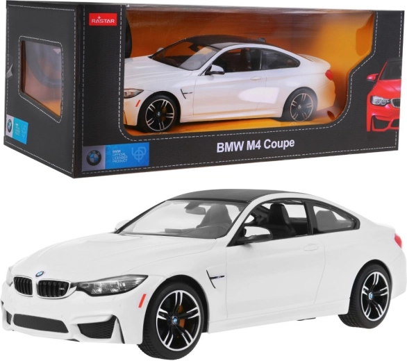 The realistic BMW M4 Coupe 1:14 model by RASTAR impresses with detailed interior and exterior craftsmanship, precise steering, and fast, smooth driving. It features a 2.4 GHz controller for stable range, LED lighting, rubber tires, and independent suspension for better grip and control.