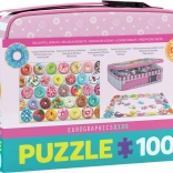 Colorful kids’ puzzle featuring delicious donuts in an original gift package – a zippered insulated lunch box. Perfect as a practical and fun gift, it includes 100 pieces, an accompanying poster/guide, and measures about 48 × 33 cm when completed.