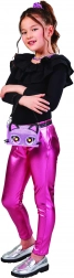 Purple sparkly fabric, kitty ears, and a metal zipper. Strap about 13 inches (33 cm) for wearing around the waist or as a mini shoulder bag.