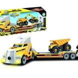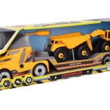 The set includes two 16 cm construction machines – a dump truck and an excavator – which can be transported on the trailer. Free-rolling wheels ensure smooth movement on various surfaces, and the robust design is ideal for everyday play at home or in the garden.