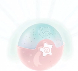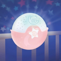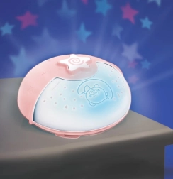 Activate the projector by pressing the ON button. It displays colorful stars and plays 6 different melodies and 3 nature sounds. It also has adjustable volume settings: loud, quiet, or off. It switches off automatically.