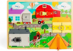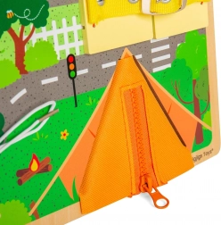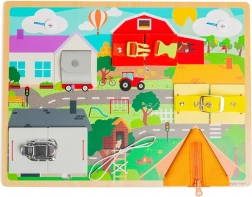 Discover a fun and educational toy for children aged 3+ – an activity board with various locks, buckles, and zippers that develops fine motor skills, hand-eye coordination, and practical life skills. Each opening reveals a hidden scene and sparks creativity and curiosity. Made from FSC-certified wood that’s kind to nature.
