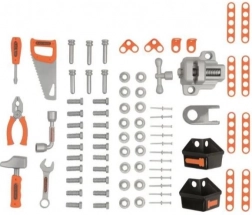 - 75 accessories including 7 tools: screwdriver, hammer, saw, wrenches (flat and socket), pliers, vice, screws, nails, and nuts.