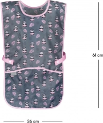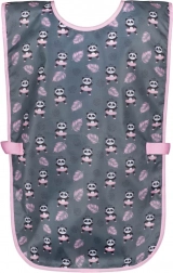 The children's apron with a panda design is designed to protect kids during various activities. It has a gray base with multicolored elements that look playful and elegant.