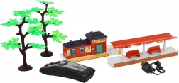 The set includes an oval track with a simple connection system, a detailed locomotive with tender and three cars, accessories such as a station building, stop platform, and trees, plus USB-powered charging. Thanks to robust plastic, the set is durable and suitable for everyday play.